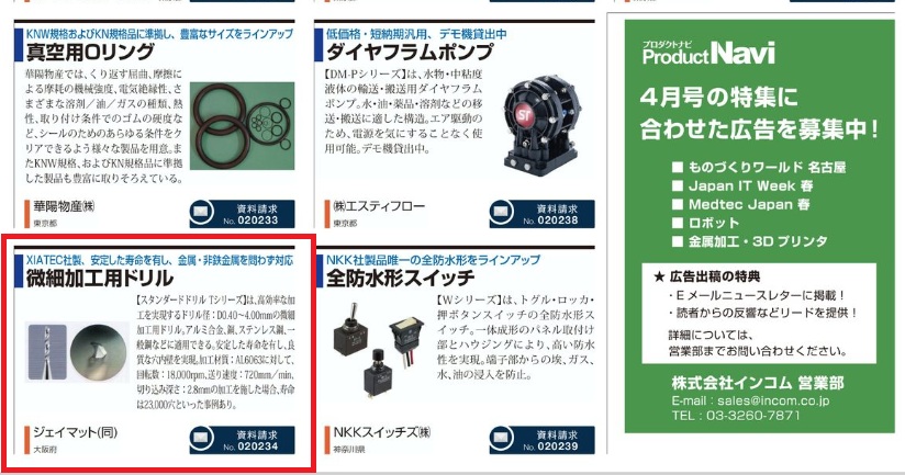 弊社の微細加工用ドリルが「プロダクトナビ」に掲載されました